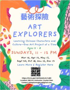 This is a drop-off class for children ages 5–8 (not a parent-child activity). Children explore Chinese culture through stories and craft—each session begins with reading a Chinese themed children’s book, creating an art project, and learning how to write and say a Chinese character related to the class theme.